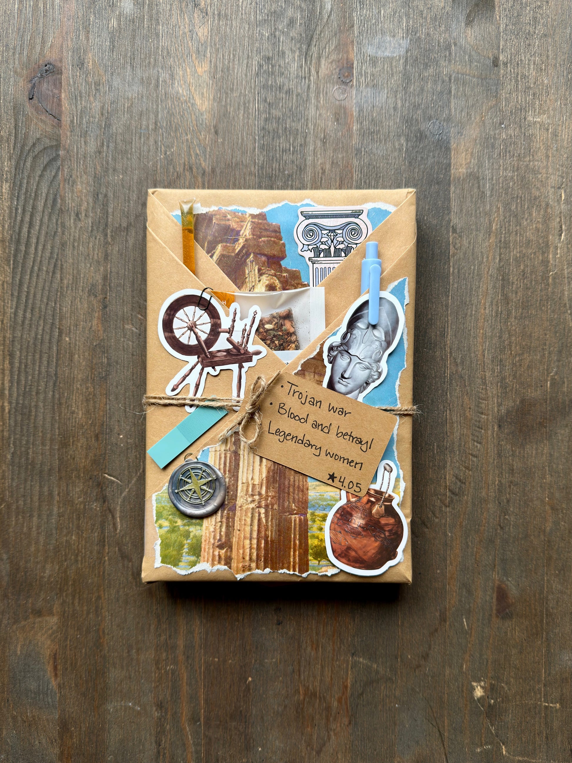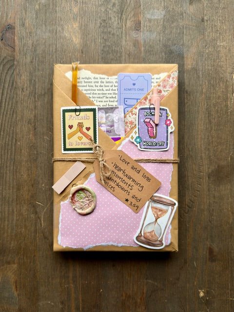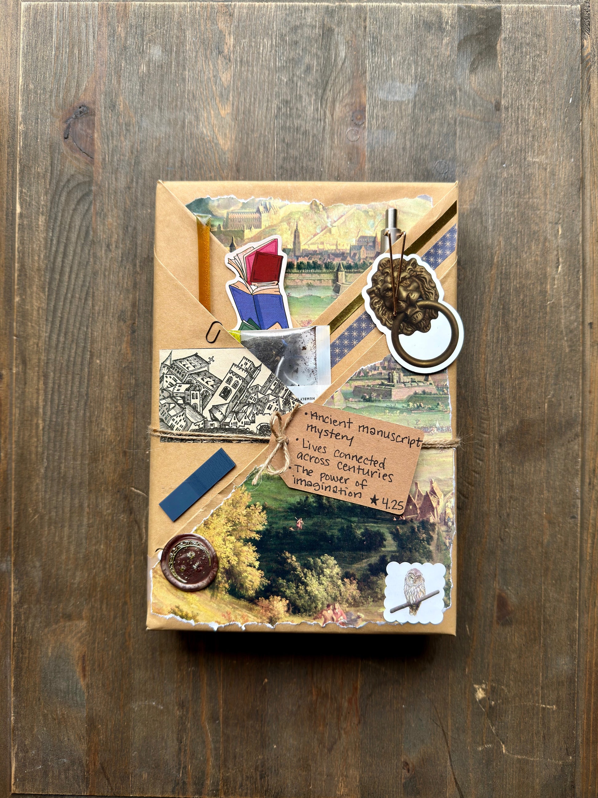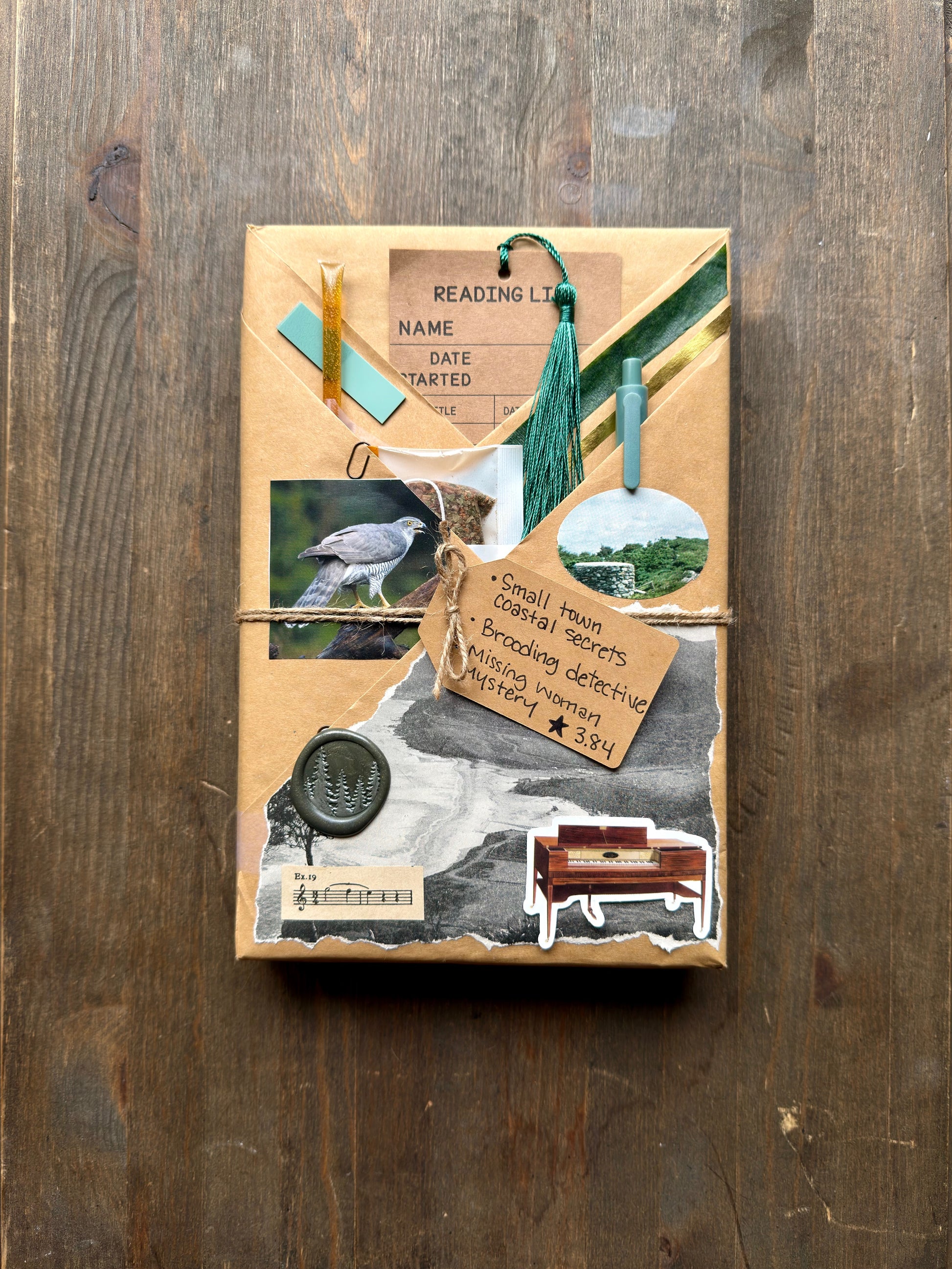 Each Blind Date with a Book is personally chosen and approved by me, featuring a gently used or like-new thrifted book. Some may be brand new, but all are in excellent, giftable condition. Every book is wrapped and decorated with ephemera I’ve collected, including vintage magazine clippings, old book cutouts, and fun stickers, adding extra clues about the story inside. Tucked alongside are a few cozy surprises to make the unwrapping feel like an experience all on its own.