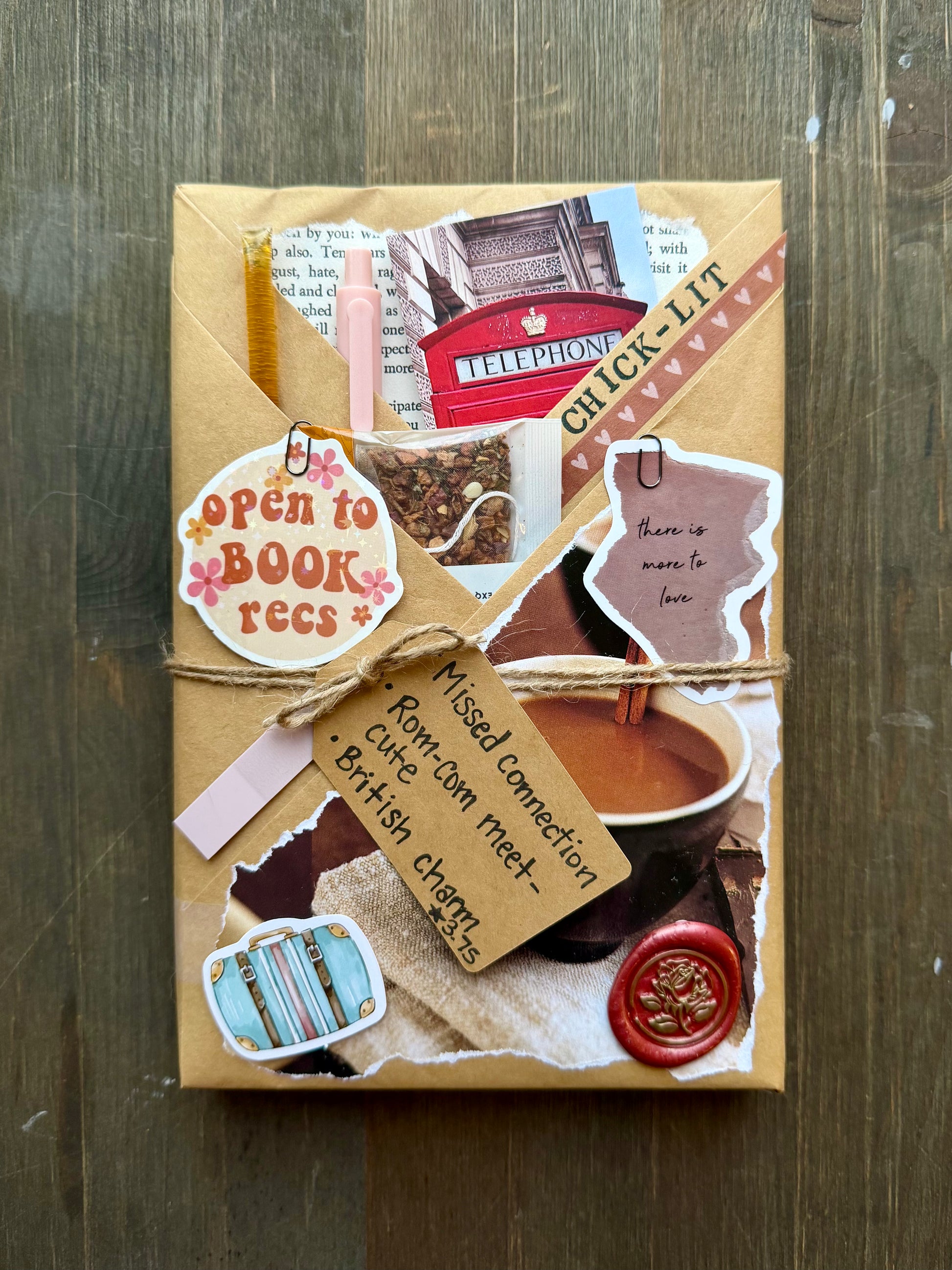 Each Blind Date with a Book is personally chosen and approved by me, featuring a gently used or like-new thrifted book. Some may be brand new, but all are in excellent, giftable condition. Every book is wrapped and decorated with ephemera I’ve collected, including vintage magazine clippings, old book cutouts, and fun stickers, adding extra clues about the story inside. Tucked alongside are a few cozy surprises to make the unwrapping feel like an experience all on its own.